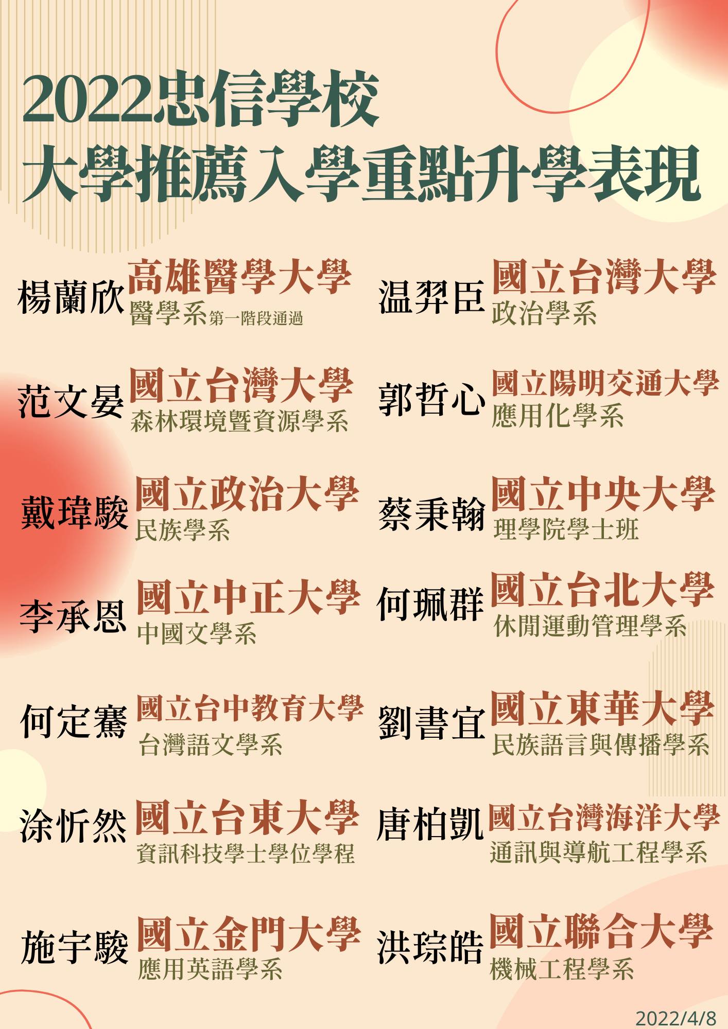 註:本資料公告前, 2022年個人申請入學尚未放榜、分科考試尚未辦理,升學表現將陸續公告。